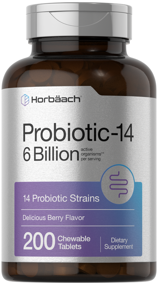 Purple supplement bottle labeled 'Probiotic-14' with Horbaach branding on a white background