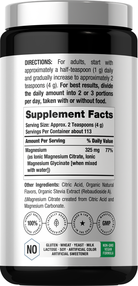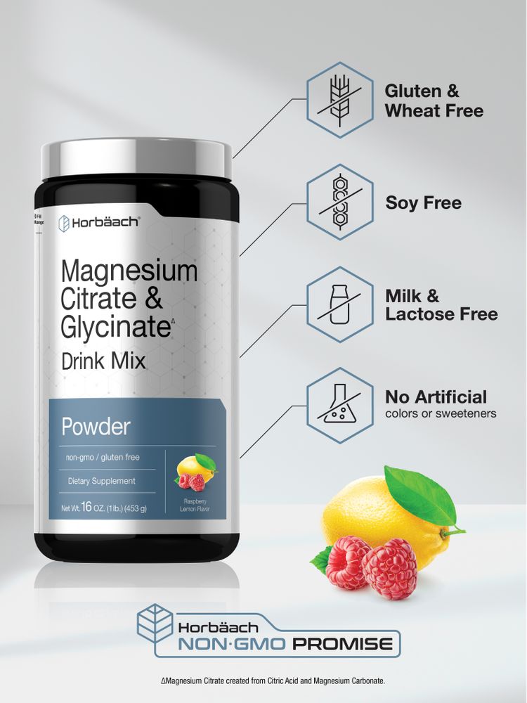 Horbaach's convenient drink mix provides 325 Magnesium (as Ionic Magnesium Citrate and Ionic Magnesium Glycinate [when mixed with water]) per serving. Our vegan formula is easy to mix and adds a delicious burst of raspberry lemon flavor! It's gluten free and non-GMO, made with no artificial color or sweetener, making it an excellent choice of Magnesium for men and women everywhere!