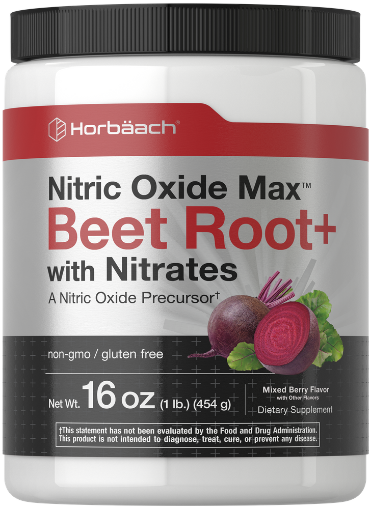 Horbaach Nitric Oxide Max Beet Root+ supplement container with beet root illustration on a white background