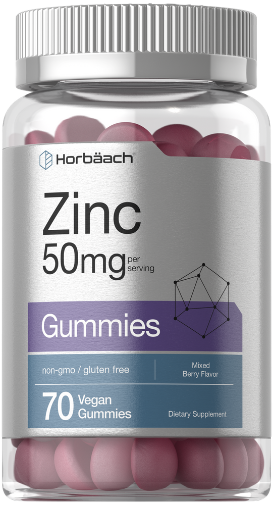 Horbaach Zinc 50mg gummies packaging with pink gummies inside