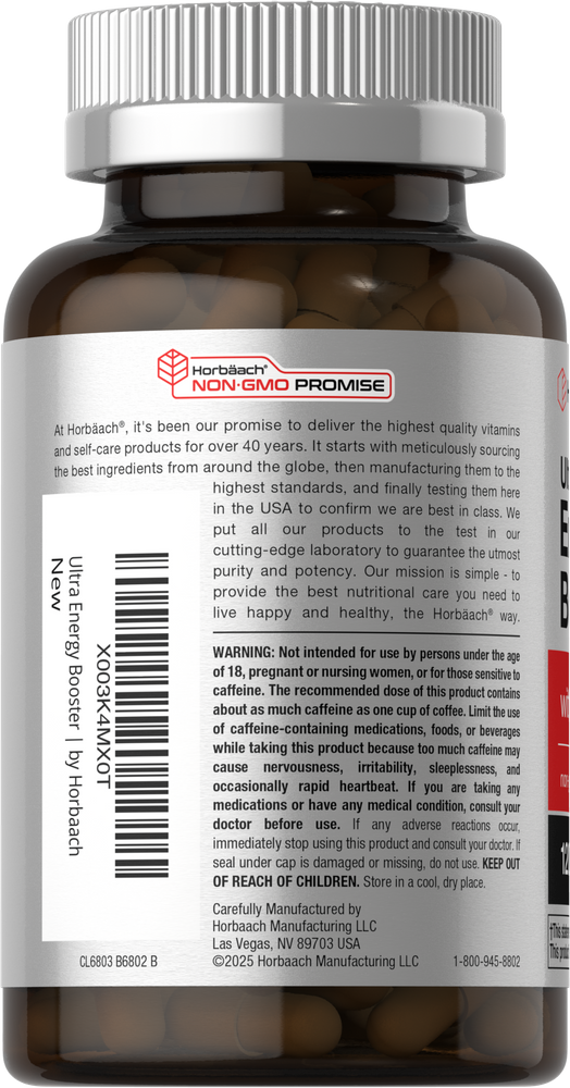 Verstärken Sie jetzt Ihre Routine mit Horbaach’s Ultra Energy Booster*! Diese hochinnovative Formel enthält 100 mg Koffein plus die Kräuter Guarana, Gotu Kola, Chinesischer Rotginseng und Grüntee-Extrakt, der für seine natürlich vorkommenden Antioxidantien bekannt ist. Unsere Formel ist glutenfrei und gentechnikfrei, hergestellt ohne künstliche Aromen oder Konservierungsstoffe, und liefert genau das, was Sie brauchen, um den Tag zu bewältigen!