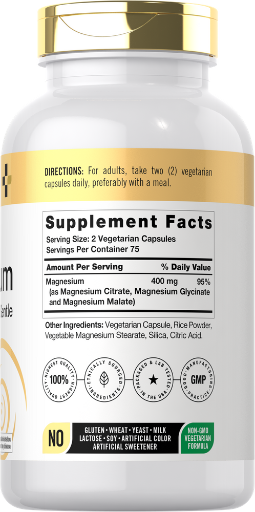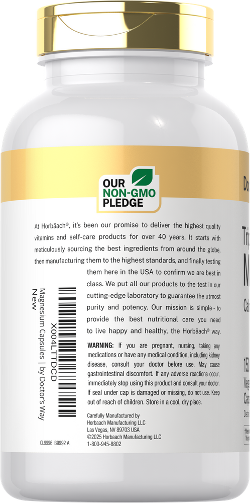 En Doctor's Way, nuestro Triple Magnesio es la fuente definitiva de magnesio, cada porción contiene una mezcla de 400 mg de Citrato de Magnesio, Glicinato y Malato. Las cápsulas vegetarianas son libres de gluten y no contienen OGMs, ¡lo que hace de este un magnesio de elección superior para adultos en todas partes!