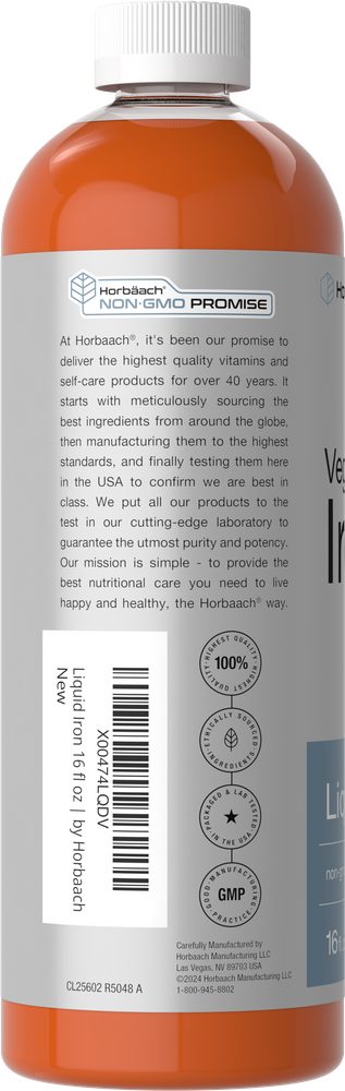 El Hierro Líquido Vegano de Horbaach proporciona 18 mg de hierro por porción (como Glicinato Férrico), el 100% de tu valor diario. ¡Nuestra fórmula vegetariana conveniente aporta este mineral esencial con un sabor a ponche de frutas que te encantará! Es sin gluten y no modificado genéticamente, hecho sin colorantes ni edulcorantes artificiales, lo que lo convierte en una opción popular de hierro para hombres y mujeres en todas partes.