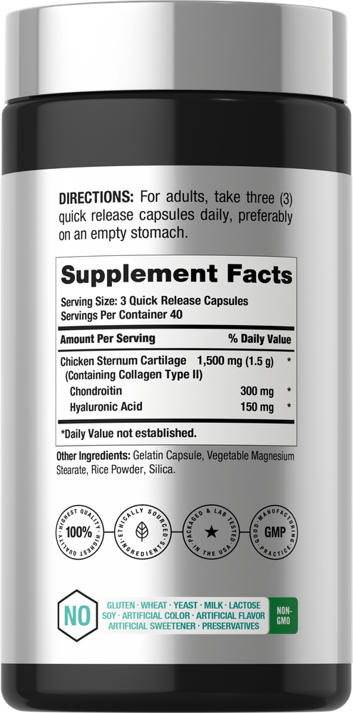 • ADVANCED FORMULA: Quick release capsules provide 1,500 mg of Chicken Sternum Cartilage per serving