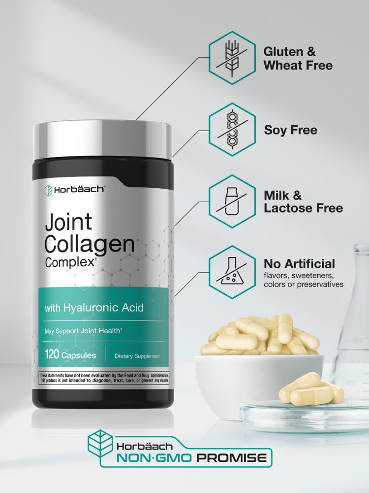 Experience the benefits of Horbaach's Joint Collagen Complex!* Our advanced formula features Collagen Type II, Chondriotin, plus Hyaluronic Acid in convenient quick release capsules! It's gluten free and non-GMO, made with no artificial flavor, sweetener, or preservatives, making it a top supplement of choice for men and women everywhere!