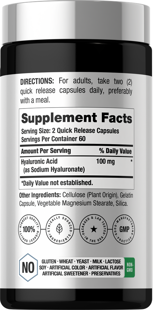 Découvrez les bienfaits de l'Acide Hyaluronique Horbaach ! Les capsules à libération rapide délivrent 100 mg par portion d'Acide Hyaluronique pour un soutien quotidien. Notre formule est sans gluten et sans OGM, fabriquée sans conservateurs, ce qui en fait un choix de premier ordre d'Acide Hyaluronique pour hommes et femmes partout dans le monde!