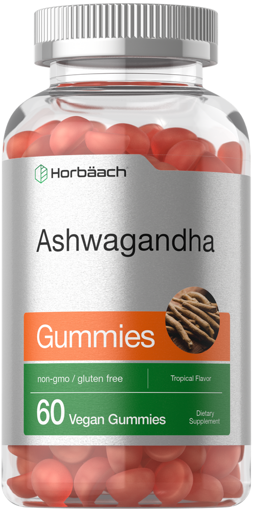 Bottle of Horbaach Ashwagandha Gummies with red gummies inside