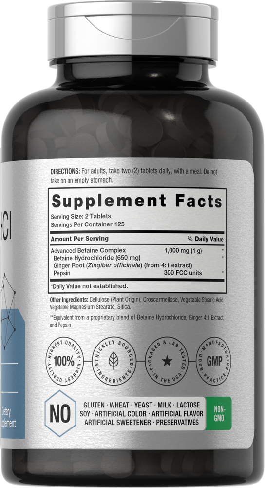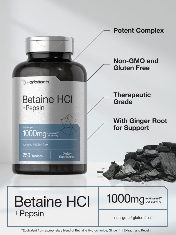 La bétaïne est un composé naturellement présent dans le corps et couramment trouvé dans les betteraves sucrières et d'autres organismes. Les suppléments de bétaïne HCl « lient » l'acide chlorhydrique à la bétaïne, ce qui donne une forme de chlorhydrate douce pour l'estomac.