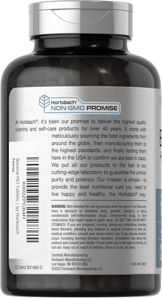 La Bétaïne HCl Horbaach est un supplément scientifiquement élaboré qui combine 1 000 mg par portion de Bétaïne HCl avec de la Pepsine et de la Racine de Gingembre dans des comprimés. Notre formule est sans gluten et sans OGM, sans édulcorant ni conservateur artificiel. Elle est testée en laboratoire pour la pureté et la puissance, garantissant une qualité exceptionnelle pour votre routine de bien-être !