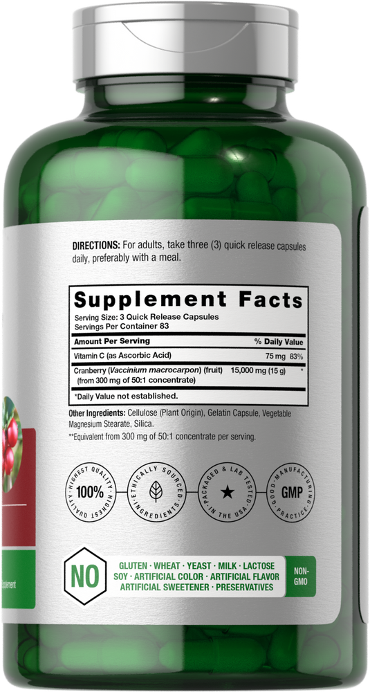 Les capsules de canneberge Horbaach contiennent tous les composants bénéfiques du jus de canneberge sans ajout de sucre. Chaque capsule à libération rapide est enrichie de l'équivalent de 15 000 mg par portion de fruit de canneberge plus de la vitamine C pour un soutien antioxydant supérieur. Notre formule est sans gluten et non-OGM, sans arôme artificiel, édulcorant artificiel ni conservateur, la meilleure source de canneberge que la nature puisse fournir !