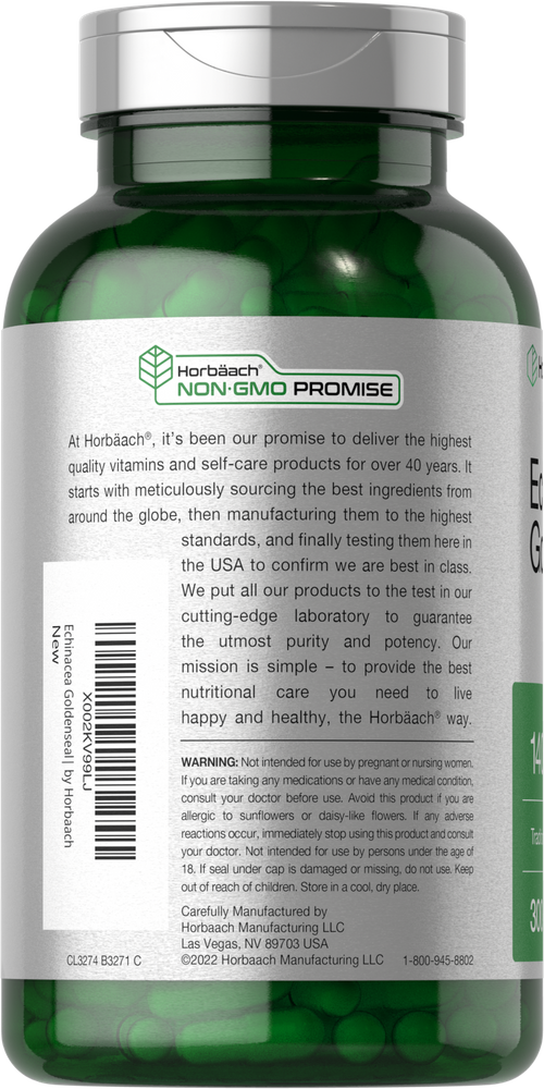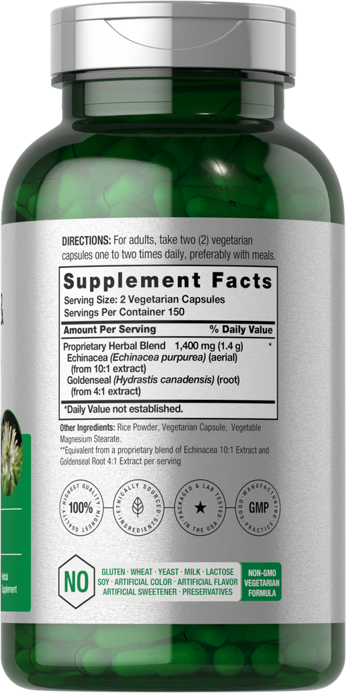 Chez Horbaach, notre formule sans OGM et sans gluten offre l'équivalent de 1 400 mg d'échinacée et de racine d'hydraste par portion pour vous offrir le meilleur de la nature, le tout dans des gélules végétariennes pratiques. Profitez dès aujourd'hui de ce mélange complexe à un rapport qualité-prix supérieur !
