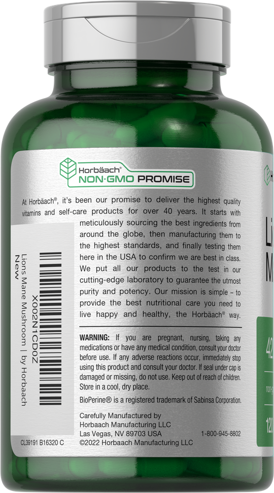 Chez Horbaach, notre formule supérieure fournit l'équivalent de 4 200 mg de champignon Crinière de Lion par portion dans des capsules végétariennes pratiques. Elle est sans OGM, sans gluten, et contient du BioPerine® (extrait de poivre noir) pour une absorption et une biodisponibilité optimales!