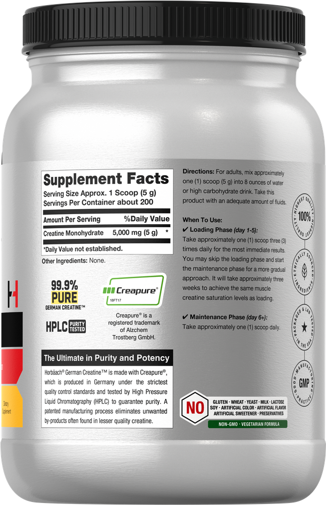 Questa formula speciale è prodotta in Germania utilizzando l'ingrediente registrato, Creapure®. Creapure è prodotto sotto rigorosi standard di controllo qualità ed è testato HPLC per garantire purezza e potenza. Come leader nella nutrizione sportiva, Horbaach ora offre questa forma innovativa di Creatina in una comoda polvere sfusa!