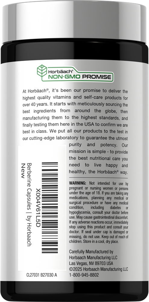 At Horbaach, our Naturally Derived Berberine Complex includes a carefully crafted blend of four potent herbs: Tree Turmeric Extract, European Barberry Extract, Coptis, and Goduchi Extract. Vegan capsules also provide 200 mg of Ceylon Cinnamon Extract plus 400 mcg of chromium (as chromium picolinate) per serving. It's gluten free and non-GMO, making it an excellent choice for adults everywhere!