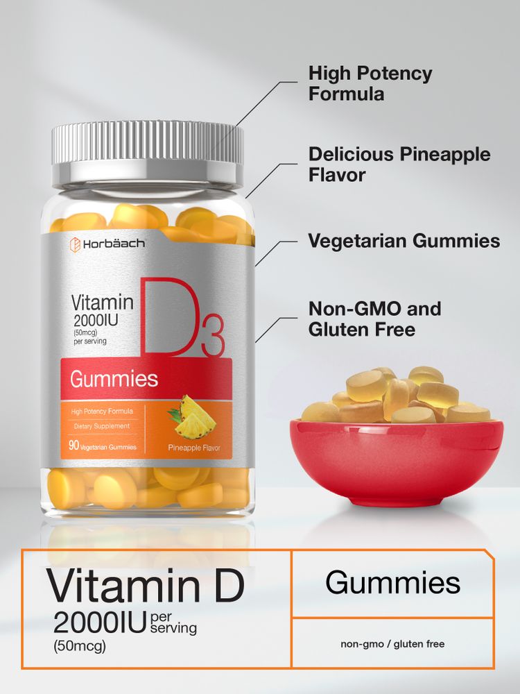 Horbaach Vitamin D Gummies for adults are the delicious way to achieve nutritional excellence. These pineapple flavored gummies deliver a blast of tropical flavor, providing 50 mcg (2,000 IU) of Vitamin D (as D3 Cholecalciferol) per serving. Our vegetarian formula is made without artificial sweetener, providing the honest nutrition you deserve in pursuit of healthy living.
