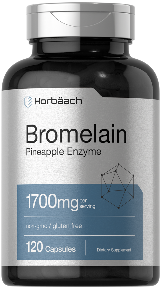 Bottle of Horbaach Bromelain supplement with black and silver design.