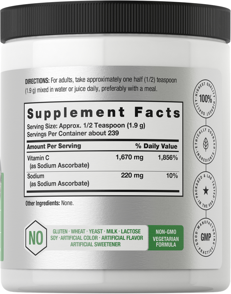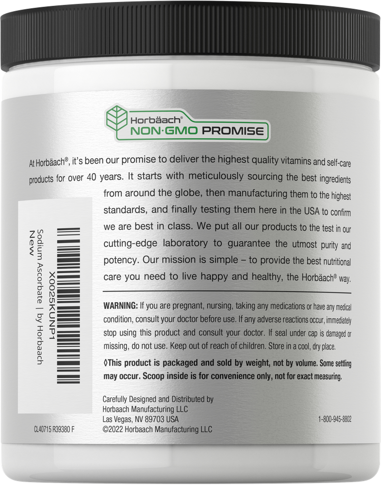 O Ascorbato de Sódio é uma forma altamente absorvível de Vitamina C, não ácida e suave para o estômago. O pó de Vitamina C de alta qualidade da Horbaach é tamponado com Ascorbato de Sódio para máxima absorção. Cada frasco de 450 gramas contém uma forma potente de Vitamina C derivada das fontes mais premium. Basta adicionar meia colher de chá às suas bebidas diariamente! Nossa Fórmula Vegetariana é Não-OGM e Livre de Glúten e Adoçantes Artificiais. Melhore sua fonte diária de Vitamina C com a Horbaach hoje!