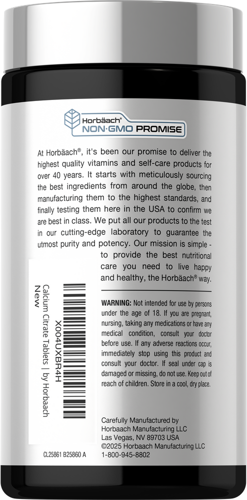 At Horbaach, convenient mini-tablets provide 800 mg of Calcium Citrate, 20 mcg Vegan D3 and 2.4 mg Boron per serving. Our formula also includes Real Food Nutrients and Bamboo Extract for added daily support. It's gluten free and non-GMO, making it a popular supplement of choice for men and women everywhere!