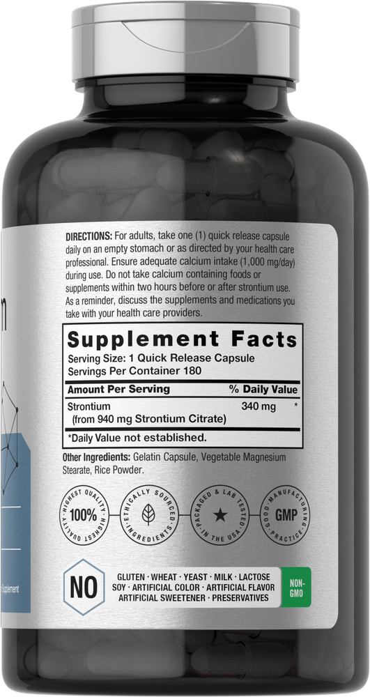 Este suplemento científico fornece 940 mg de Estrôncio (a partir do Citrato de Estrôncio) por porção em cápsulas de liberação rápida e conveniente. Nossa fórmula avançada é livre de glúten, não transgênica e sem conservantes, tornando-se o melhor suplemento de suporte para homens e mulheres em todo lugar.