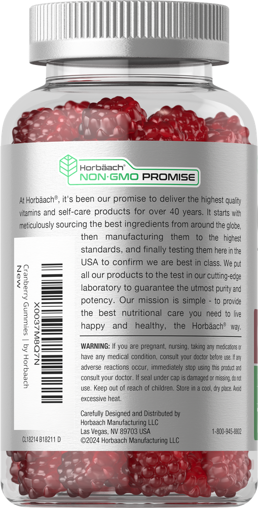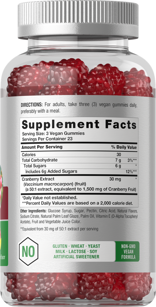 Essas deliciosas gomas estão repletas do equivalente a 1.500 mg de fruta de Cranberry por porção e são ricas no delicioso sabor de Cereja Manga. Nossa fórmula vegana é livre de glúten e não contém OGM, sem corantes artificiais e apenas 2g de açúcar por porção. É a maneira deliciosa para homens e mulheres adultos aproveitarem Cranberry todos os dias!