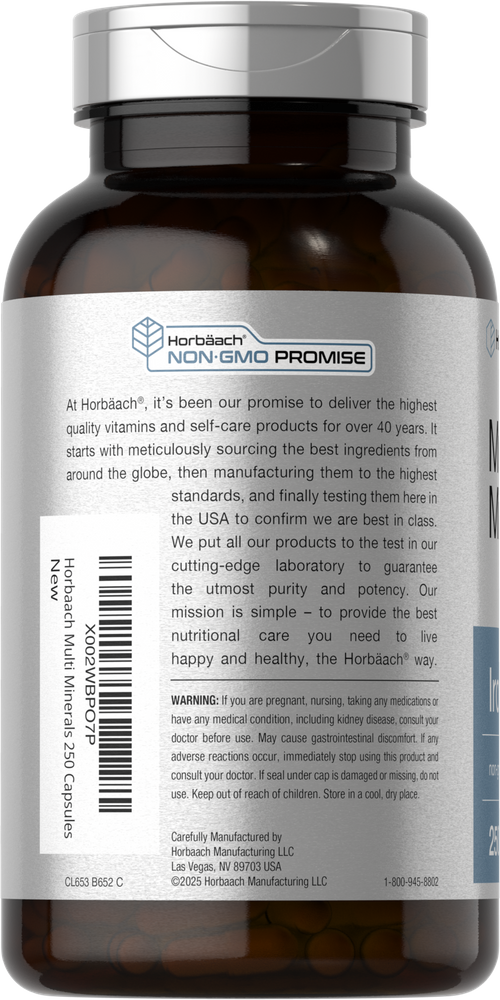 O Complexo Multimineral Horbaach é cientificamente elaborado com uma ampla gama de nutrientes para suporte diário. Formulado sem Ferro, nosso suplemento oferece Cálcio, Iodo, Magnésio, Zinco e mais em cápsulas de liberação rápida e conveniente. É sem glúten, não transgênico, e a fórmula mineral definitiva para uma rotina equilibrada.